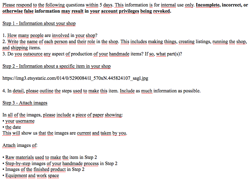 I know I should just shut up and do as they ask.But for once my Etsy sales have been dropping continuously and I've been keeping putting money by listing stuff in that shop.They've been mean and kicked out real handmade sellers out, some I know personally.They also robbed me of a listing fee because they shut down one of my listing because the title didn't suit a small firm. Never refunded me of that listing fee though.And I mean, really? I made tutorials, I'm showing my working atelier in my etsy shop. I have been doing that stuff since 2008. It's all over the web, I'm on basically any existing website and they think I'm a reseller?I've been paying 4000$ in listings and commissions since the beginning to those disrespectful idiots.And now I'm getting this.cheers.Angry StephUPDATE 1UPDATE 2