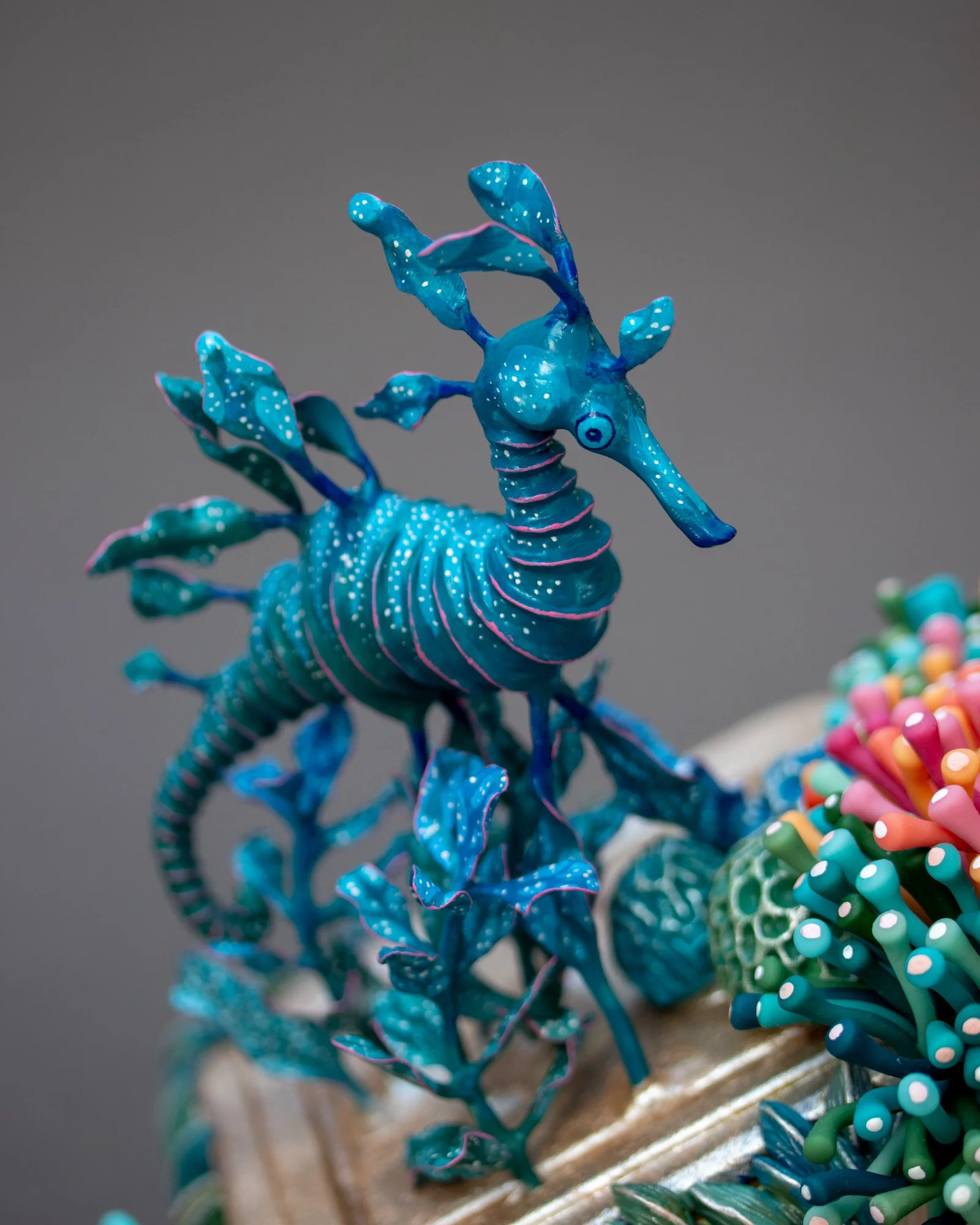 A plastic box painted in sparkly metallic champagne colored paint has been covered in corals, mussels and sea anemones. This new environment creates a habitat for a turquoise colored seahorse.
